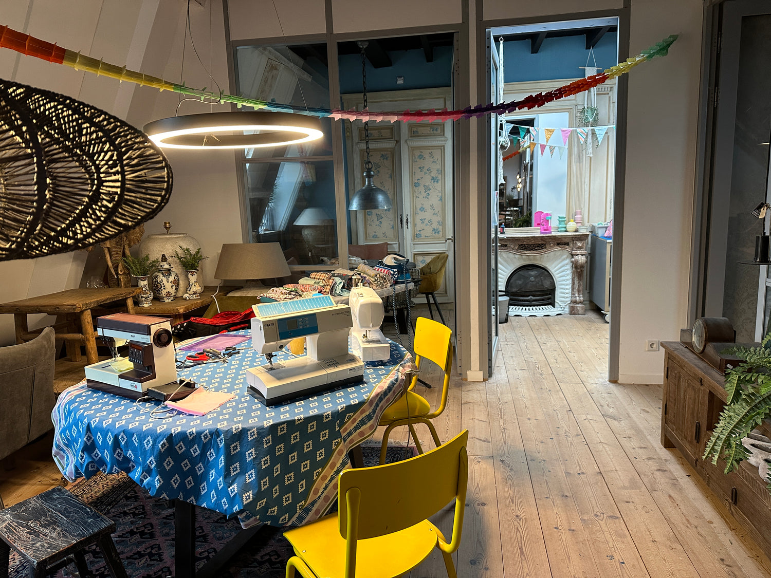 Het gebruik van naaimachines, gereedschappen en stoffen is bij de prijs inbergrepen. Ook onbeperkt ranja of water en tussendoor een snackje.