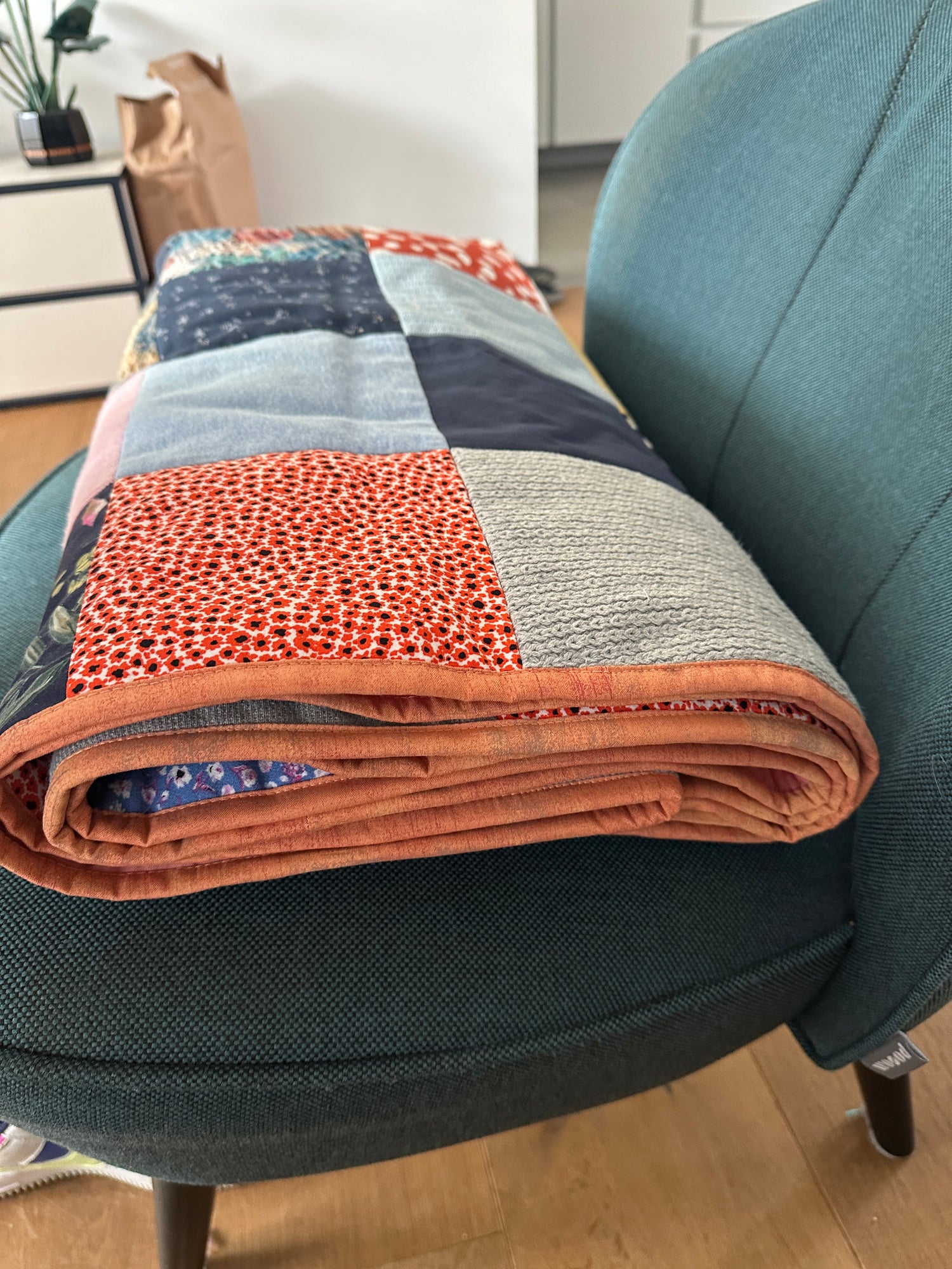 Lizette wilde heel graag een fijne deken voor op de bank met stofjes van kleding van haar moeder. Samen knipten we de bijna 100 lapjes en daarna naaide ik deze prachtige deken.